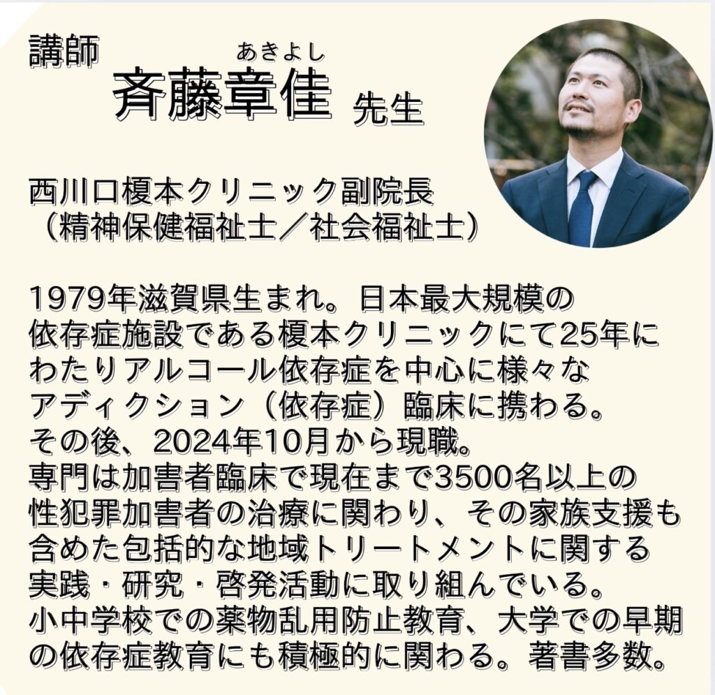 5月は、アルコール依存症を中心とした様々なアディクション(依存症)臨床・加害者臨床に長く携わってこられた、西川口榎本クリニック副院長(精神保健福祉士/社会福祉士) enomoto-clinic.jp/clinic/nishikawaguchi/ の斉藤章佳先生をお招きします。3500名以上の加害者臨床の視点から浮き彫りになる、『男性というジェンダーの生きづらさ』『男らしさの弊害』『男尊女卑依存症社会』などの貴重なお話を伺います。講座はどなたでもご参加できます。後日配信のみのご参加も可能です。※注 Zoomなどのオンライン講座・ハイブリッド講座ではありません。