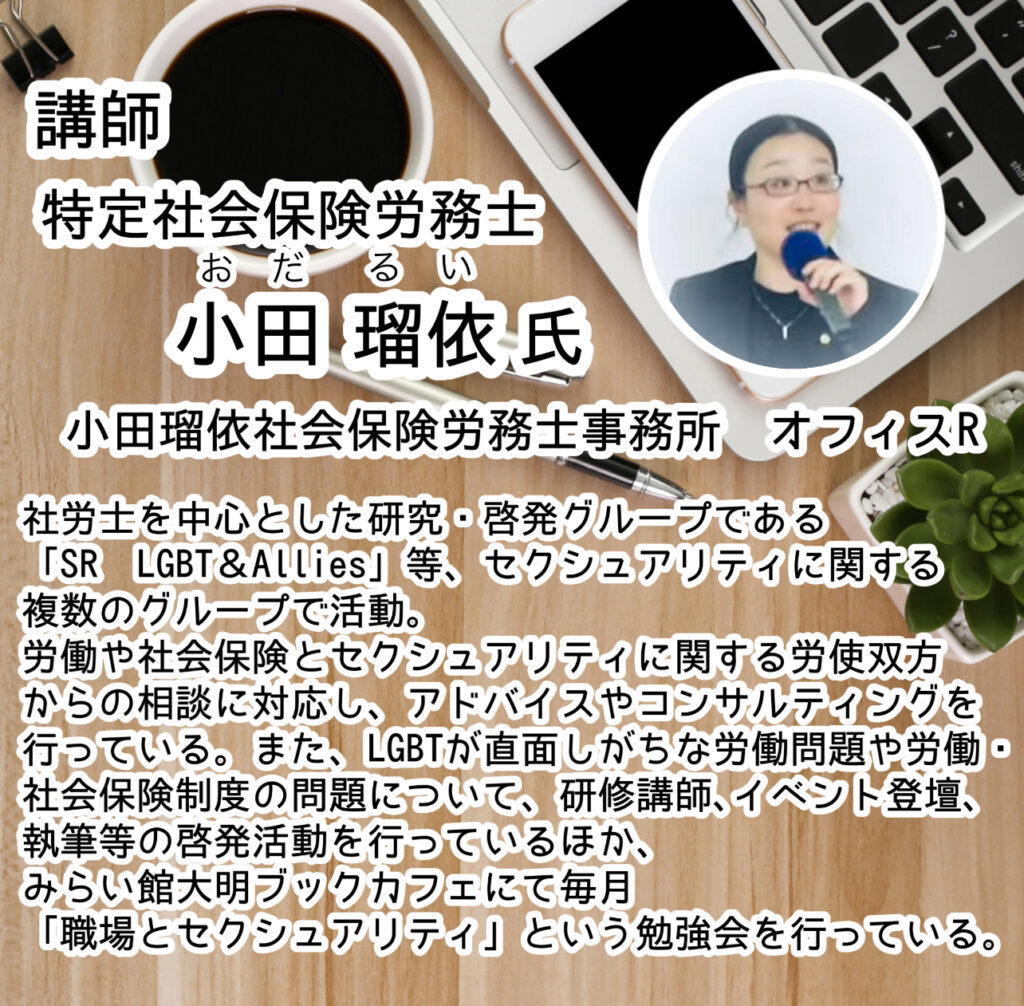 昨年11月の中小企業診断士さんによる講座は、とても学びの多いものでした。2月はさらに、職場におけるダイバーシティについて、社会保険労務士の小田先生から、より深く学びましょう。「令和6年度版 厚生労働省委託事業 職場におけるダイバーシティ調査・推進事業報告書」の作成に委員として関わった小田先生より、わかりやすいポイントを押さえたお話のほか、社労士としての、労働や社会保険とセクシュアリティに関する様々なご経験を伺います。講座はどなたでもご参加できます。後日配信のみのご参加も可能です。※注 Zoomなどのオンライン講座・ハイブリッド講座ではありません。