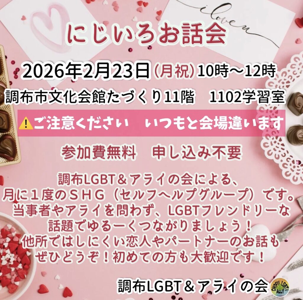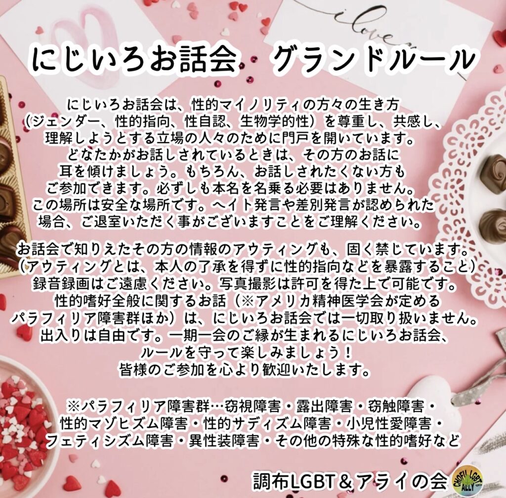 にじいろお話会は、SHG(セルフヘルプグループ)として、LGBTフレンドリーな話題で当事者やアライが月1回、ゆるーくつながる場です。他所では話せない恋人やパートナーとのお話、多様なご自身の性に関するお話をぜひどうぞ!ジェンダーやセクシュアリティーについて学びたい方、アライになりたい方も大歓迎です。お名前を名乗る必要はありませんし、必ずしもご自身のお話をしなくてはいけない、ということもありません。