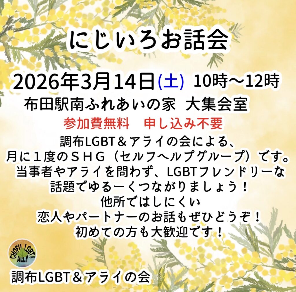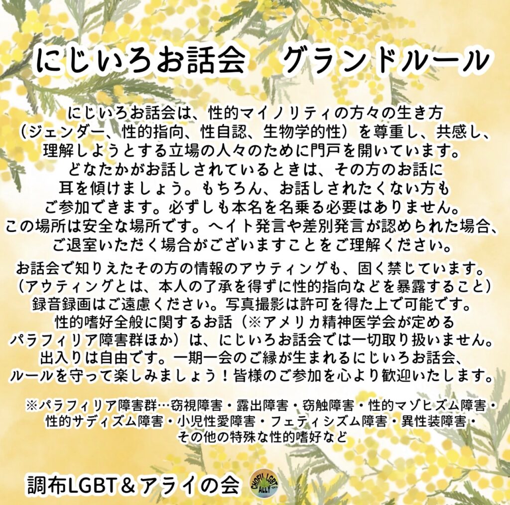 にじいろお話会は、SHG(セルフヘルプグループ)として、LGBTフレンドリーな話題で当事者やアライが月1回、ゆるーくつながる場です。他所では話せない恋人やパートナーとのお話、多様なご自身の性に関するお話をぜひどうぞ!ジェンダーやセクシュアリティーについて学びたい方、アライになりたい方も大歓迎です。お名前を名乗る必要はありませんし、必ずしもご自身のお話をしなくてはいけない、ということもありません。