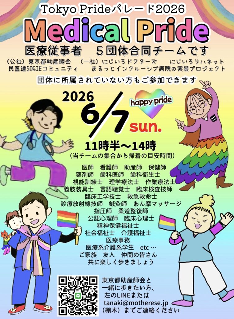 2024年からは「Medical Pride」医療従事者5団体合同チームとして参加しています。医療従事者5団体…東京都助産師会、にじいろドクターズ、にじいろリハネット、民医連SOGIEコミュニティ、まるっとインクルーシブ病院の実装プロジェクト、と共に、およそ200人の梯団を結成します。